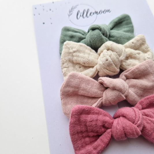 Muslina matu sprādzīšu komplekts meitenēm – 4 pasteļtoņu bantītes