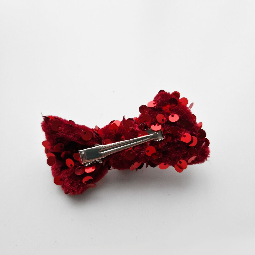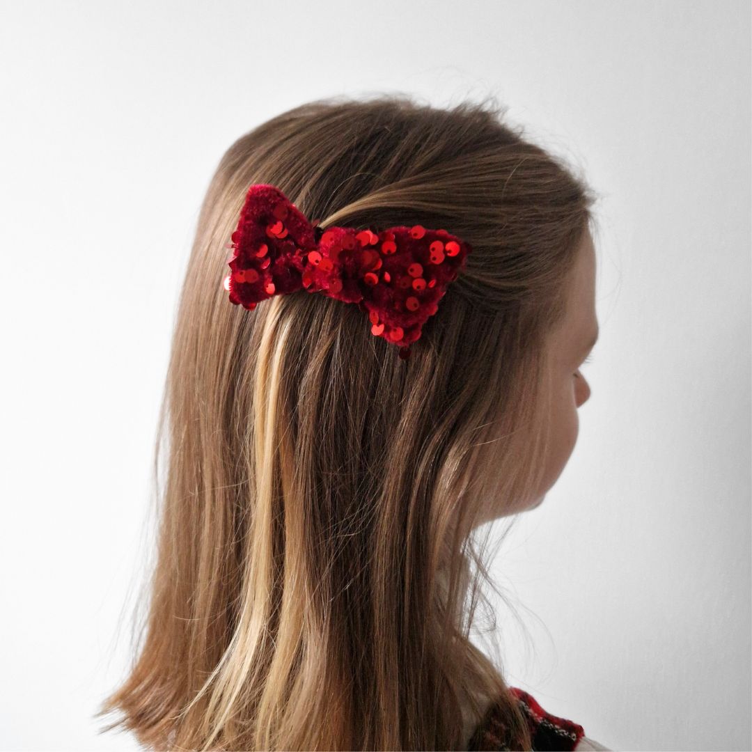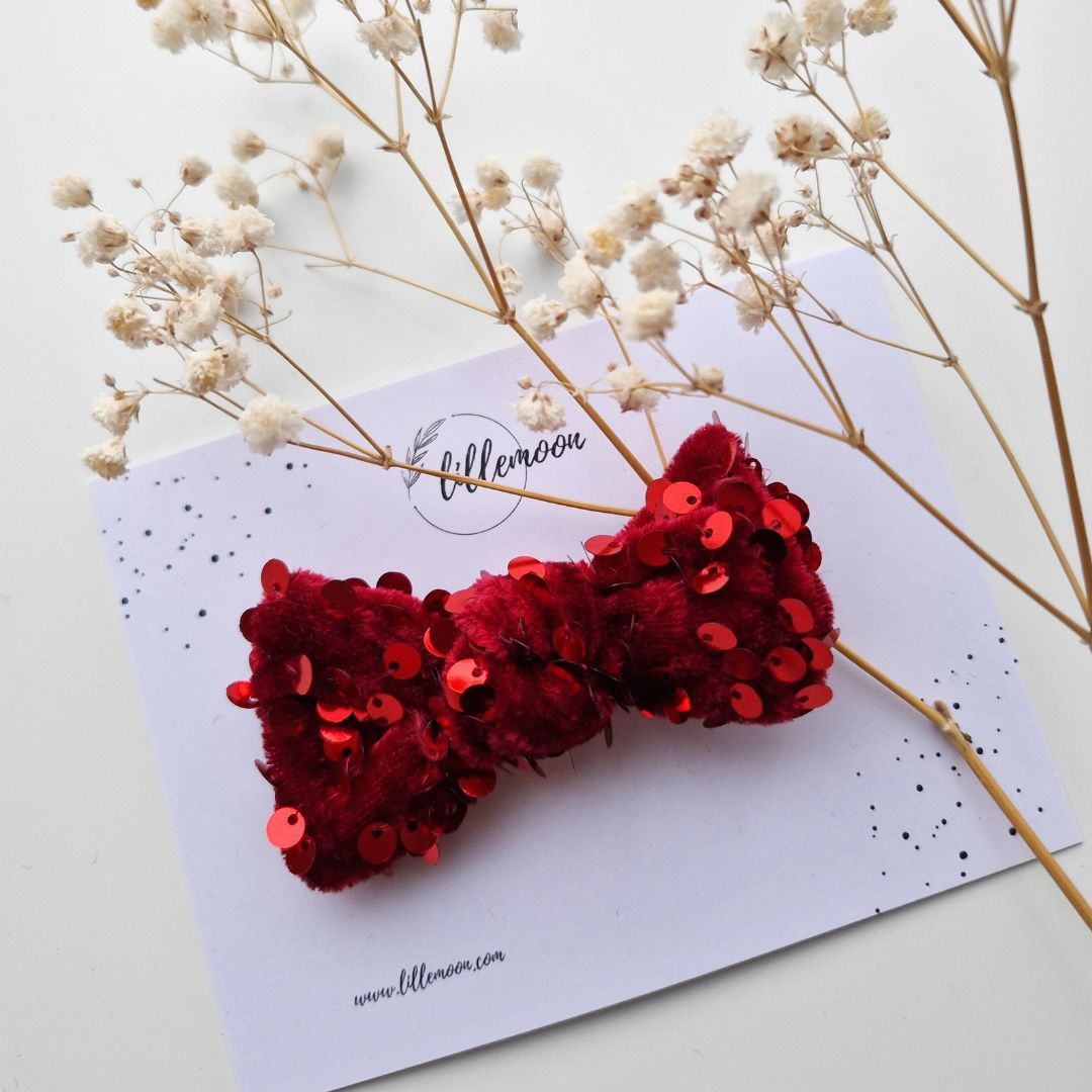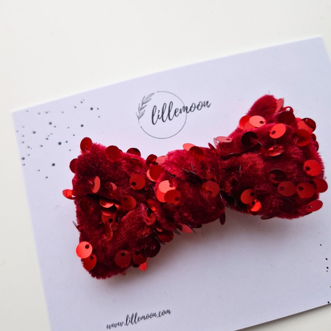 Mirdzoša mazā Ziemassvētku bante, kas piešķir matiem īstu svētku burvību! Šūta no upcycled samtaina auduma, rotāta ar zeltainiem un sarkaniem spīguļiem, tāpēc katra bante ir mazliet unikāla un ļoti ierobežotā daudzumā.