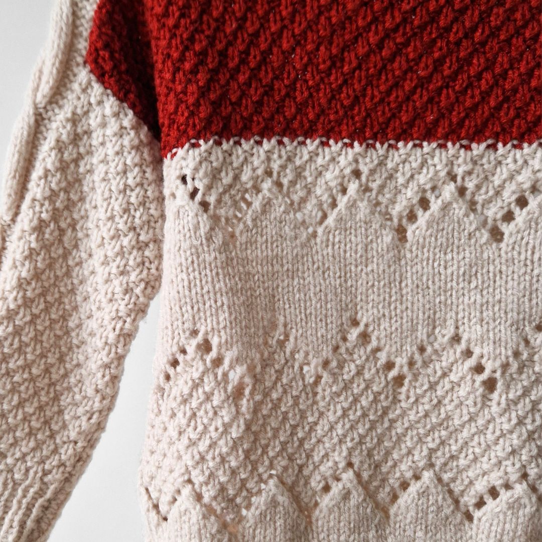 Rokām darināts džemperis mīkstā krēmkrāsā ar sarkanīgu ķieģeļu krāsas akcentu ir īpaši silts un mājīgs – tieši tāds, kādu kāds ir darinājis ar rūpību un mīlestību. Greznā rakstu tehnika un nedaudz rustic sajūta piešķir tam unikālu šarmu, kuru nav iespējams atrast masveida ražojumos. Pateicoties vilnas sastāvam (pēc sajūtām – dabīgā vilna), džemperis ir silts, elpojošs un perfekts vēsajām dienām. Rūpīgi atlasīts pre-loved (mazlietots) apģērbs izcilā stāvoklī — izmazgāts, sakopts un gatavs jaunam piedzīvojumam. Ideāls izvēlei, kas apvieno siltumu, ērtumu un ilgtspējīgu skaistumu.