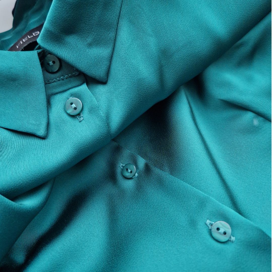 Šī elegantā satīna blūze smaragdzaļā krāsā (vairāk zaļa, nekā zilgazaļa, kā redzams bildēs, grūti noķert toni) ir lielisks kapsulas garderobes papildinājums — universāla, gaumīga un viegli kombinējama gan ikdienai, gan svētkiem. Biezs, kvalitatīvs satīna audums krīt skaisti un piešķir izskatu, kas vienmēr izskatās nedaudz īpašāks.