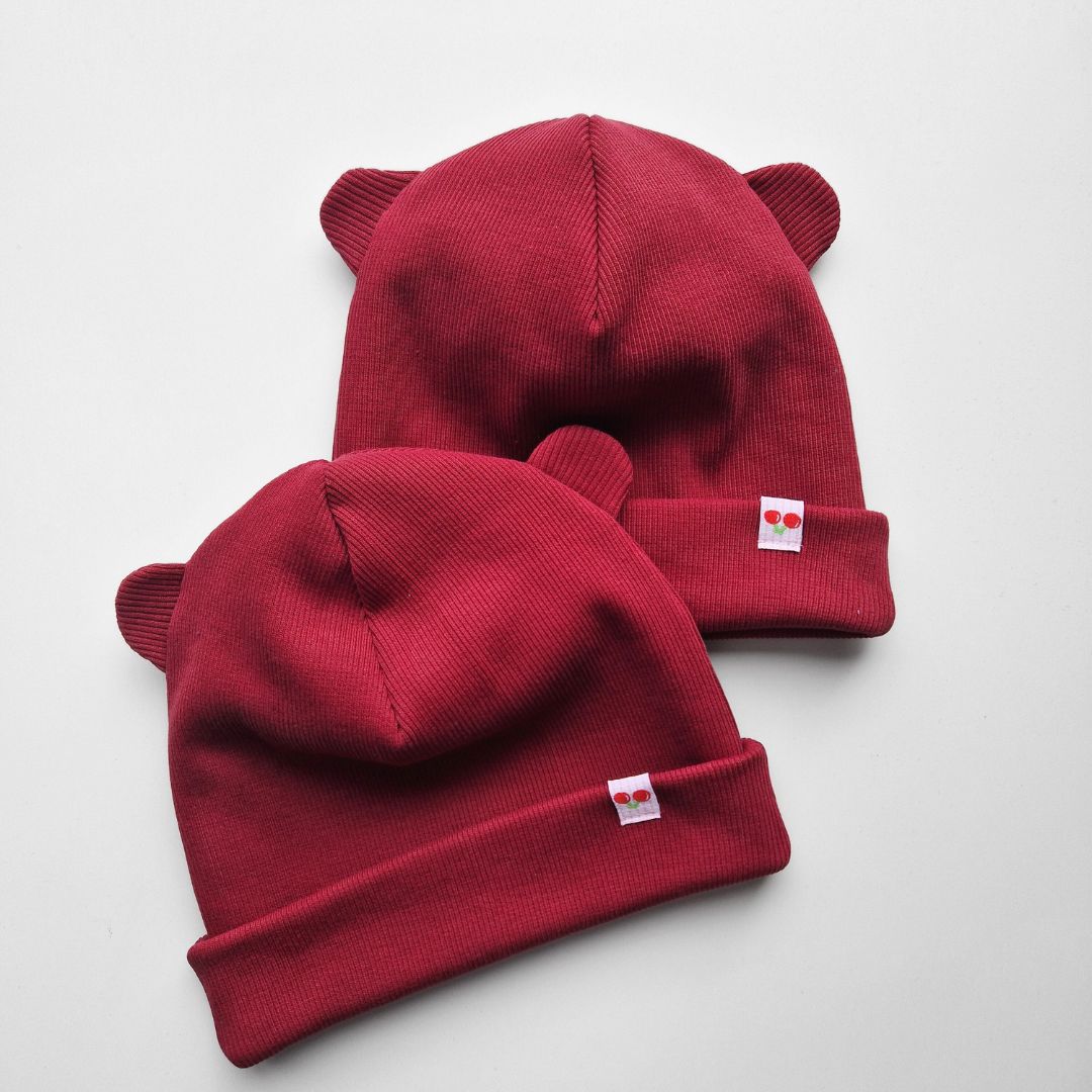 Rievotās trikotāžas cepure ar austiņām - ķiršu sarkana