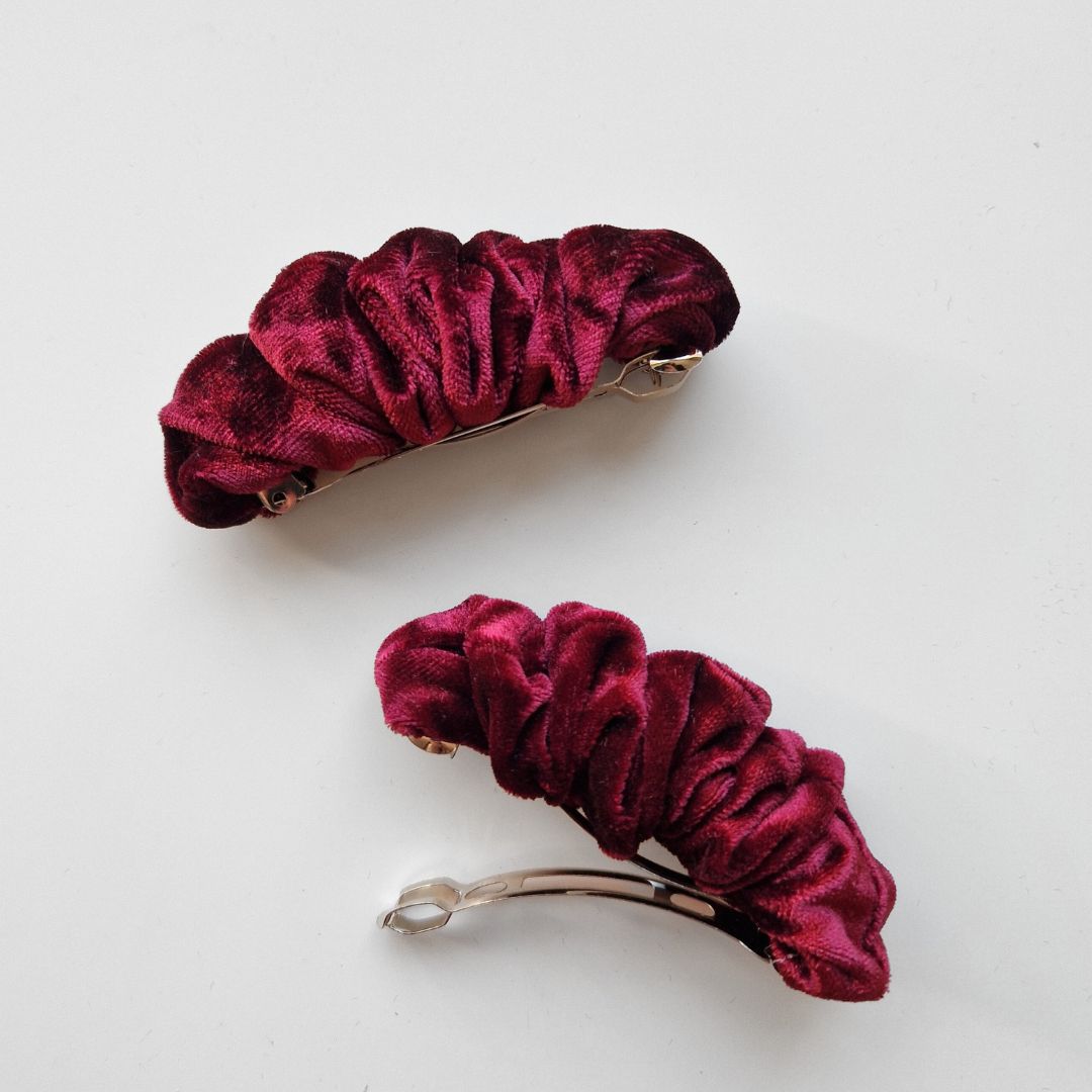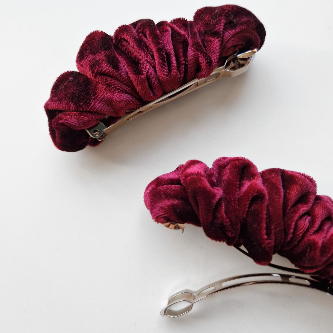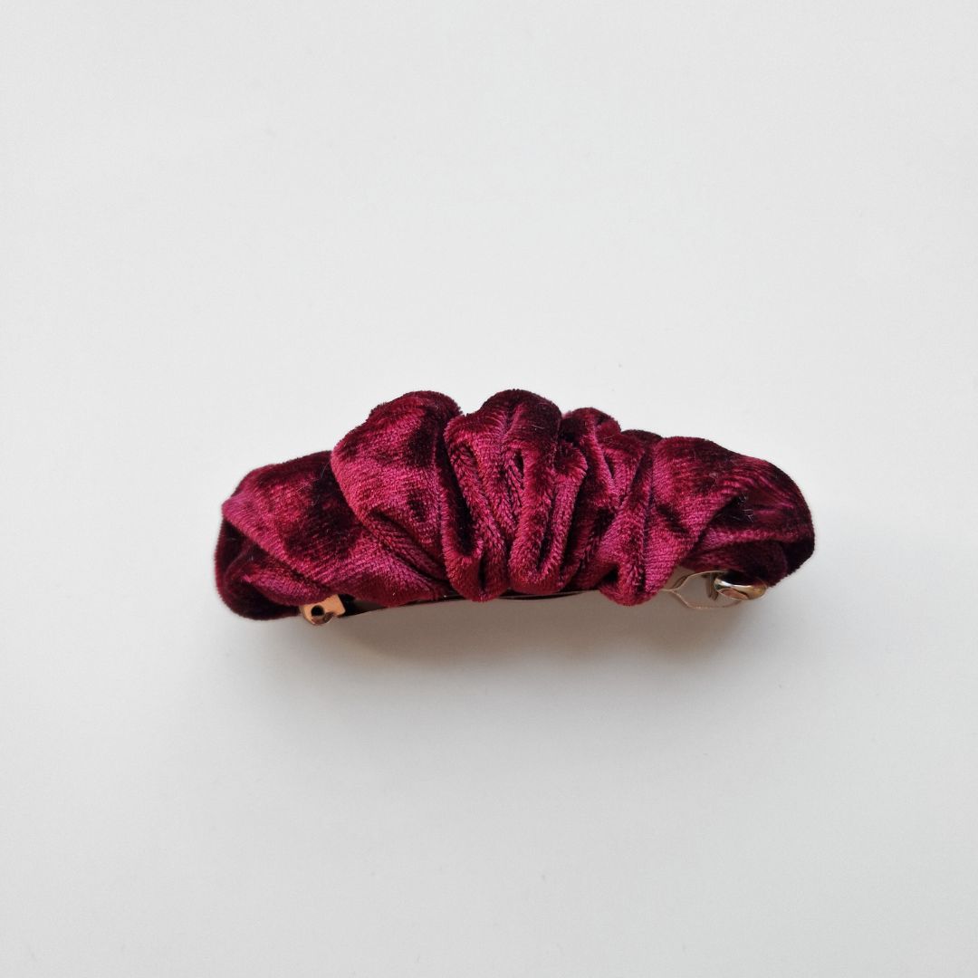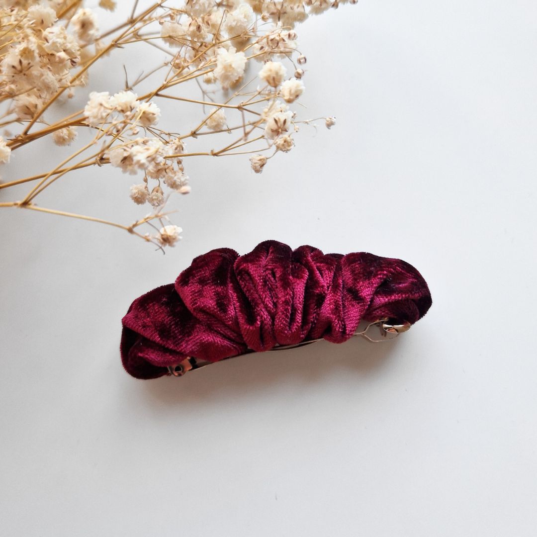 Samta matu sprādze bordo krāsā - roku darbs, kas piešķir aksesuāram personisku pieskārienu un augstu kvalitāti. Piemērota gan mazām dāmām no 3+ gadiem, gan pieaugušajām, piešķirot frizūrai izsmalcinātu akcentu ikdienā vai svētkos.