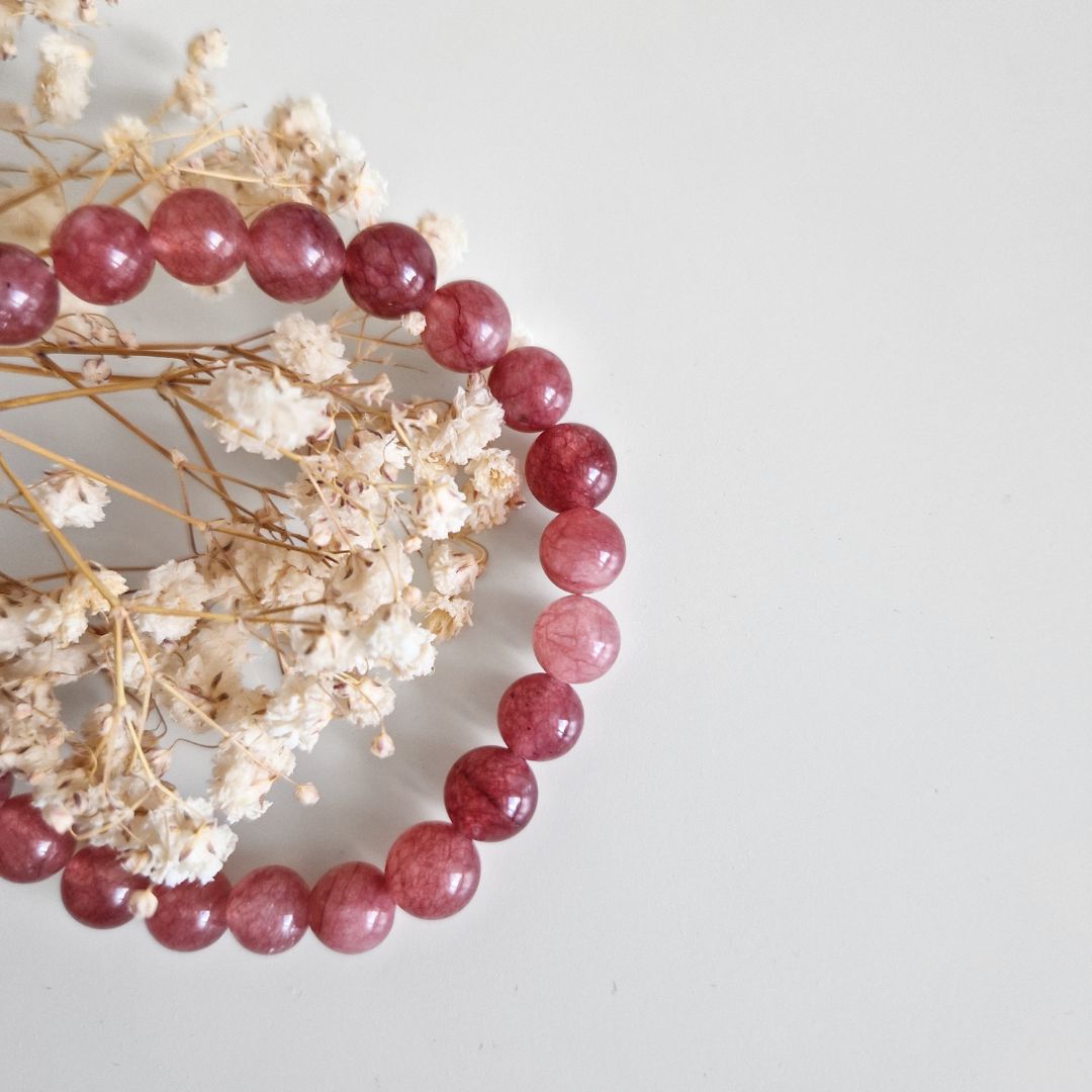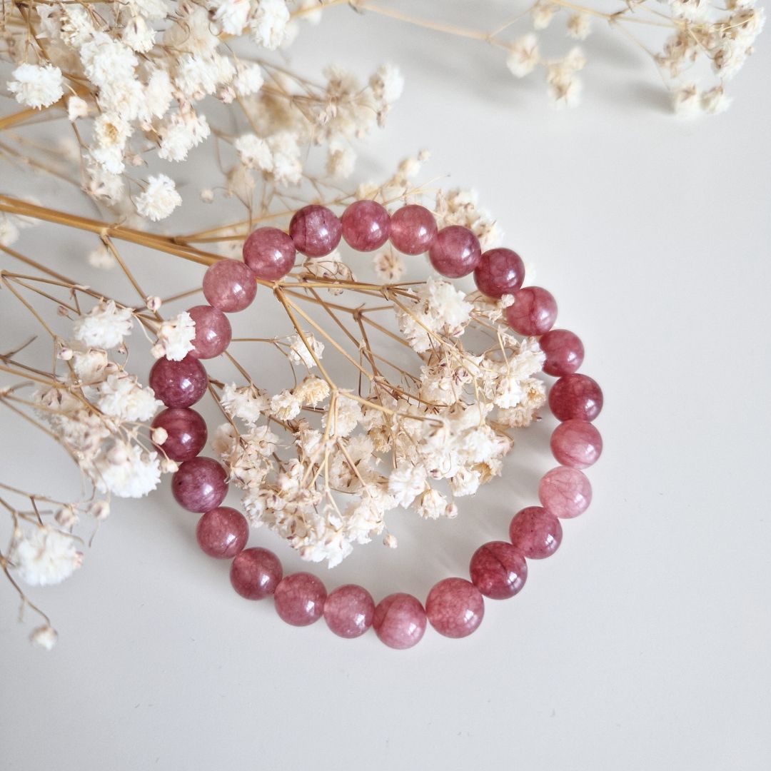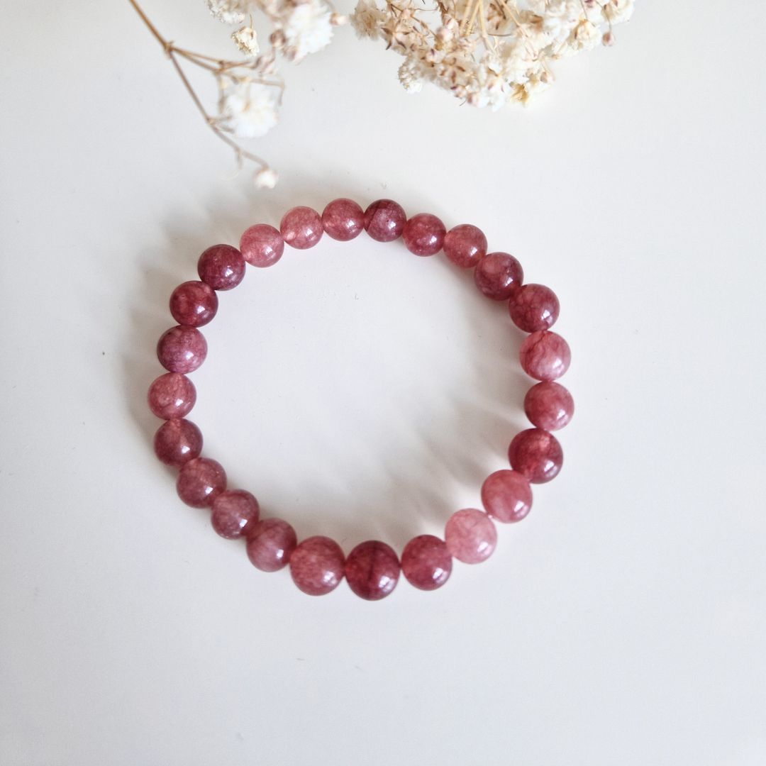 Zemeņu kvarcs ir kā mazs mīlestības dzirksteles nesējs. Tas palīdz atvērt sirdi, pieņemt sevi un citus ar maigumu, kā arī sajust dzīves skaistumu ikdienā. Šis kristāls veicina prieku, rotaļīgumu un pateicību – īpaši tajos brīžos, kad gribas vairāk viegluma un siltuma. Valkājot šo aproci, sajutīsi, ka sirds atveras jaunām emocijām un dzīve kļūst krāsaināka.